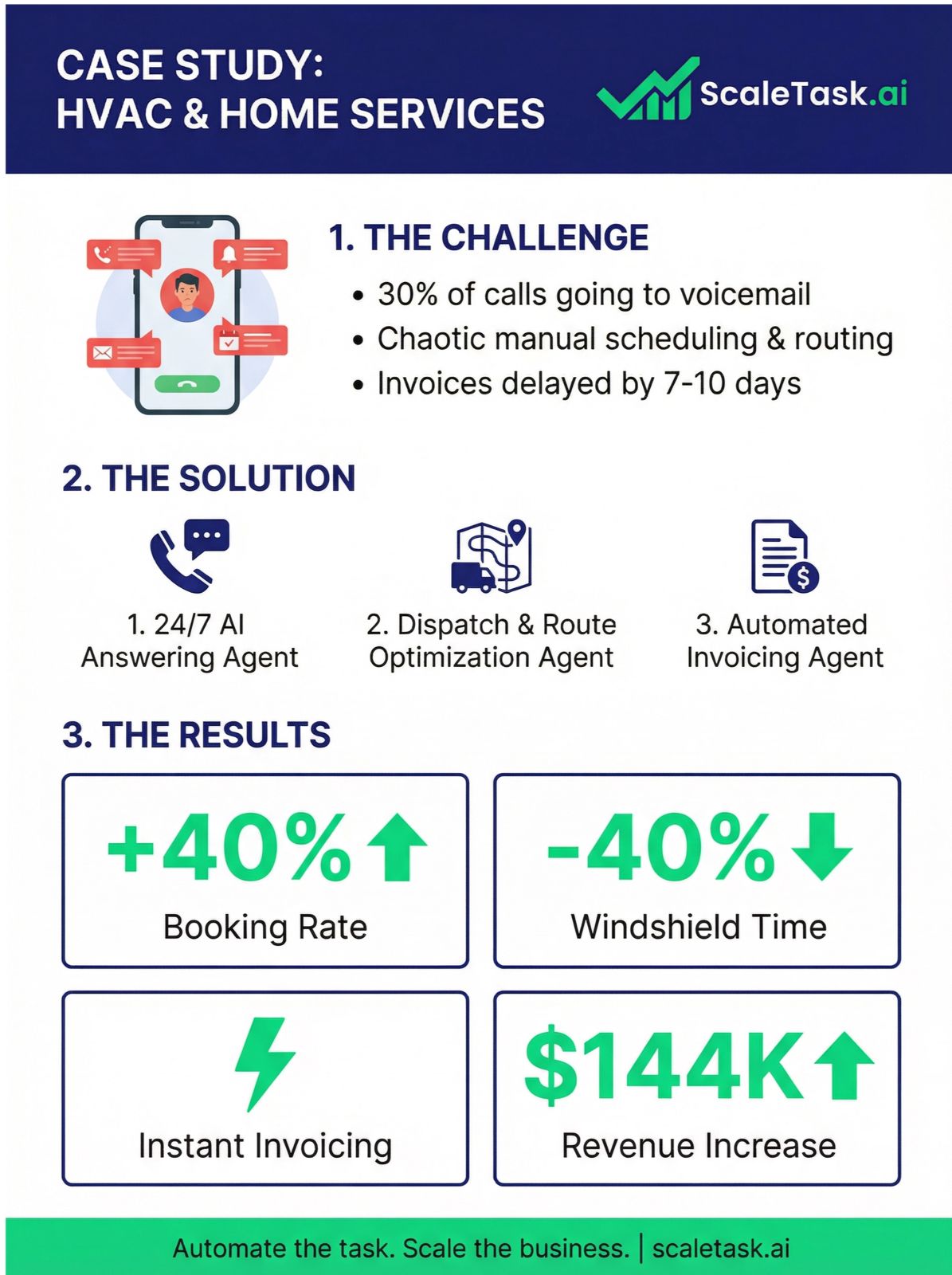 ScaleTask.ai deploys intelligent AI agents to automate your team's most repetitive, time-consuming tasks. We help Staffing Agencies and Home Service companies eliminate 20+ hours of manual work per employee per week, cutting operational costs by up to 30%.